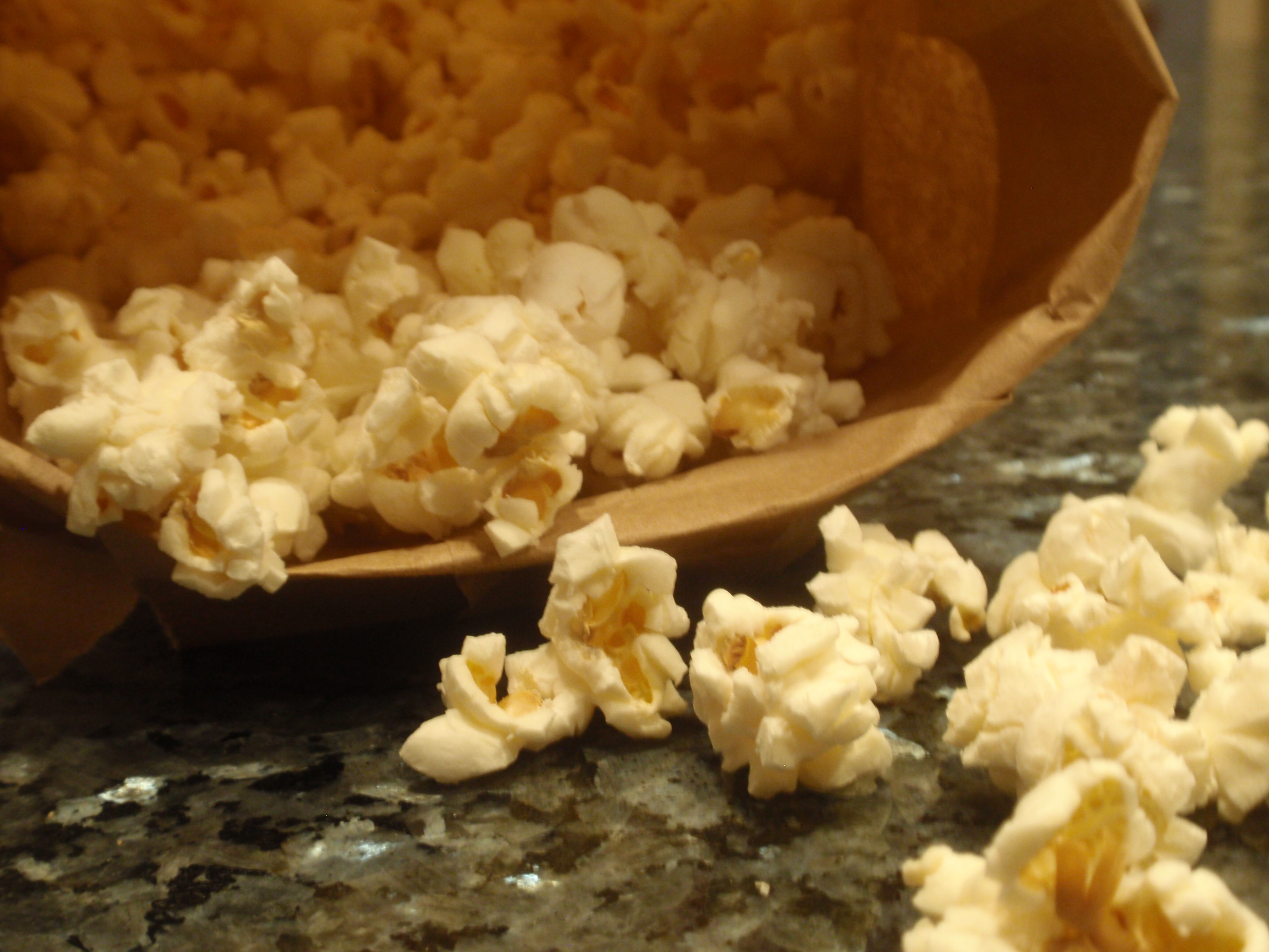Place the kernels in the bag and fold the top edge over a few times to seal.  Place in the microwave folded side down and cook 1 minute 45 seconds.  Add toppings and enjoy!