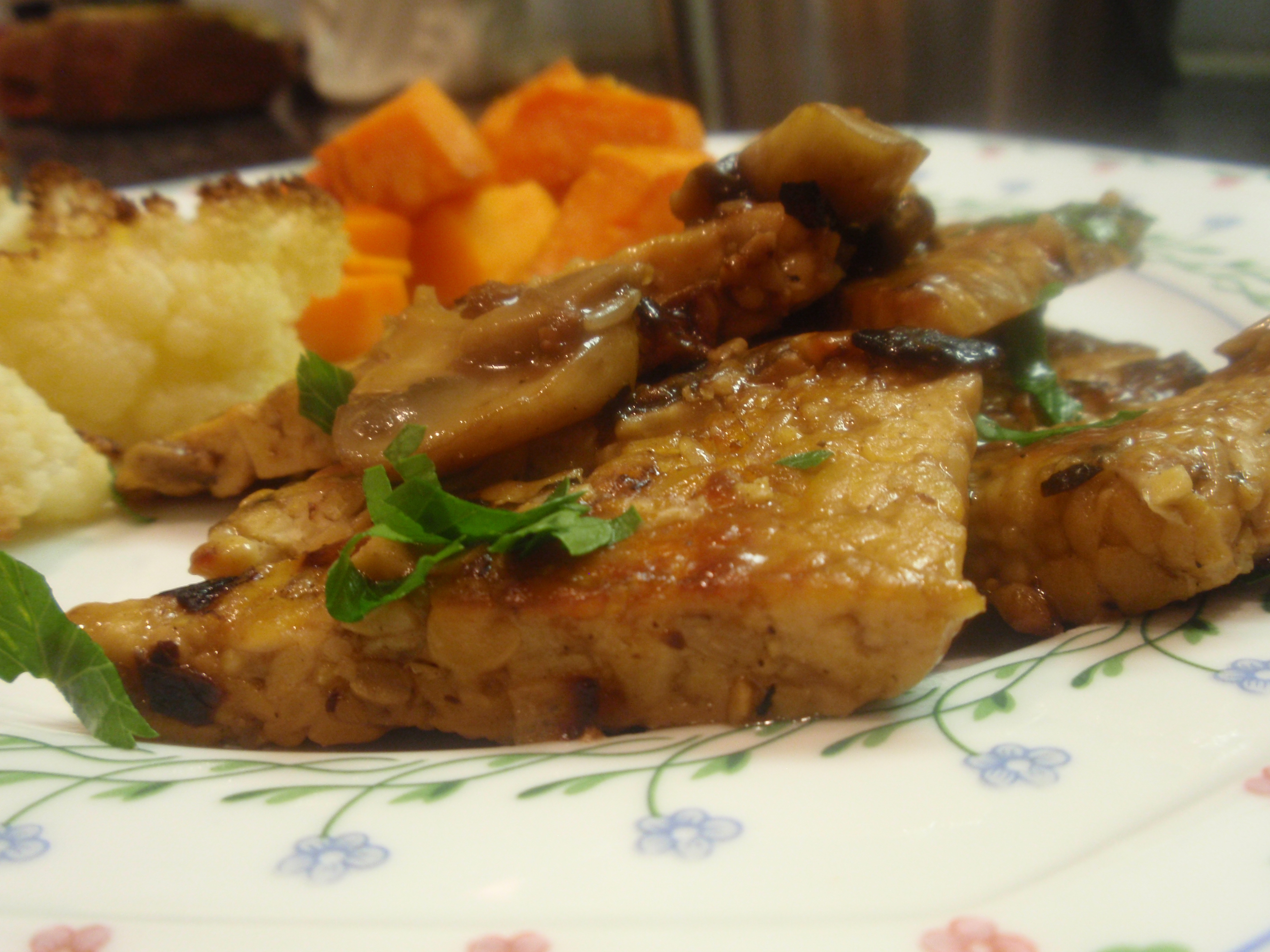 Melt 2 T of the “butter” in a large pan over medium heat. Add the shallots and cook for 5 minutes, stirring occasionally, until softened. Place half of the tempeh triangles on top of the shallots and cook until browned, about 5 minutes per side. Remove that batch of tempeh, melt the remaining 1 T “butter, and cook the remaining tempeh triangles. Remove this second batch of tempeh from the pan. Add the olive oil and the mushrooms, season with salt and pepper, and cook until the mushrooms are tender, about 5 minutes. Pour 3/4 c of marsala into the pan and turn up to medium high heat. Once it is bubbling, cook for 5 minutes more to burn out the alcohol.
