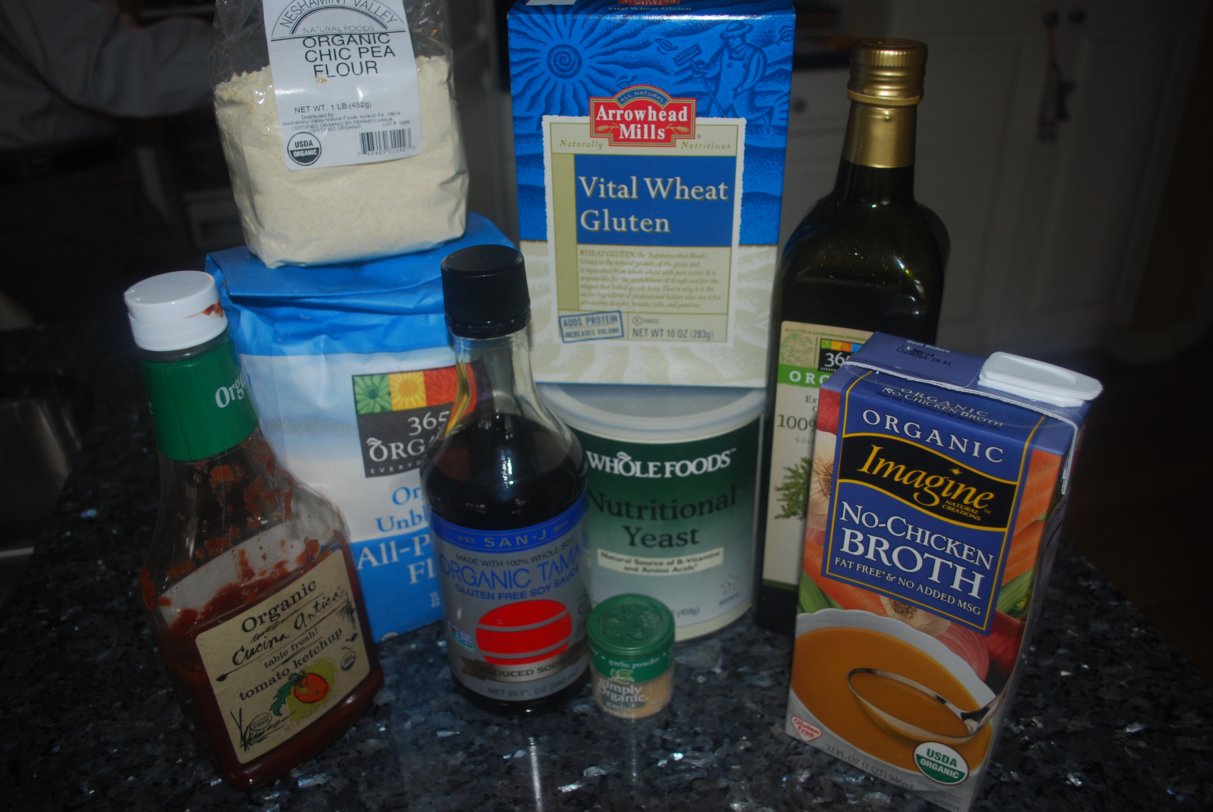 - 2 c vital wheat gluten – you can get this pre-packaged from Arrowhead Mills for example (they carry this at my local Shoprite) or you can get it in bulk from health food stores and specialty markets like Whole Foods.