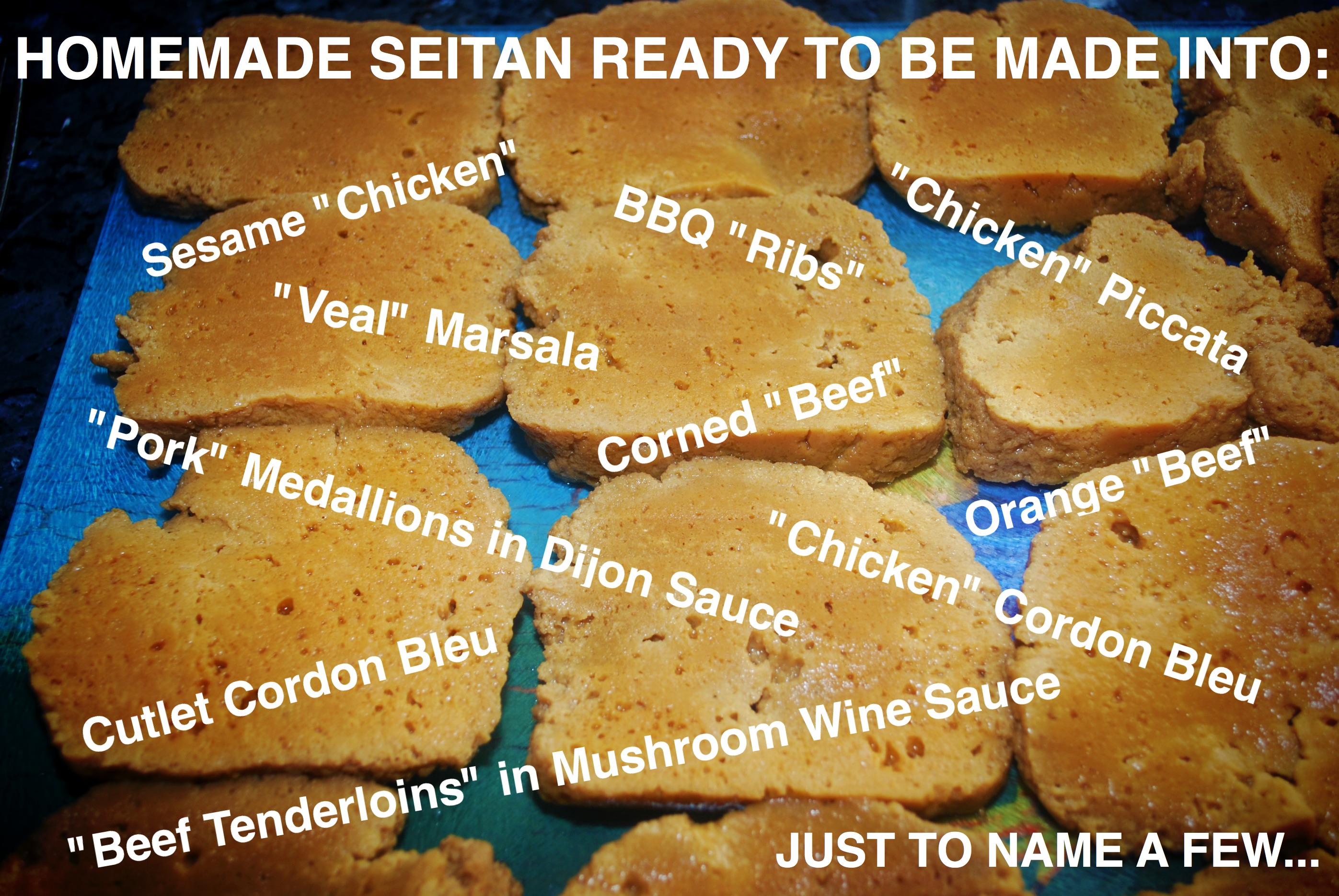 I really love SEITAN!! For those of you who are not familiar with it, let me get you up to speed. Seitan is a plant-based meat alternative made from wheat gluten. The beauty of seitan is that it is really easy to make at home and freezes well too! And who wouldn’t love a protein source that offers 20 grams of protein for each 3 ounce serving and yet only 1.5 grams of heart-healthy monounsaturated fat? Seitan is also very versatile. It can be baked, grilled, sauteed, fried, or prepared just about any way that you would prepare meat. So who needs that nasty meat anyway? If you have not tried to make seitan yourself, please go for it. You will be glad you did. If you are not into cooking, you can purchase seitan at health food stores and specialty markets like Whole Foods. When I am in a rush, I will use the West Soy brand, but the pieces are small and imho are best suited for a quick stir fry. Not that there is anything at all wrong with that! That is delicious! However, in many of my recipes, the seitan is much better when it is the size of what a cutlet of meat would be. By making my own seitan, I can make it any size I want.