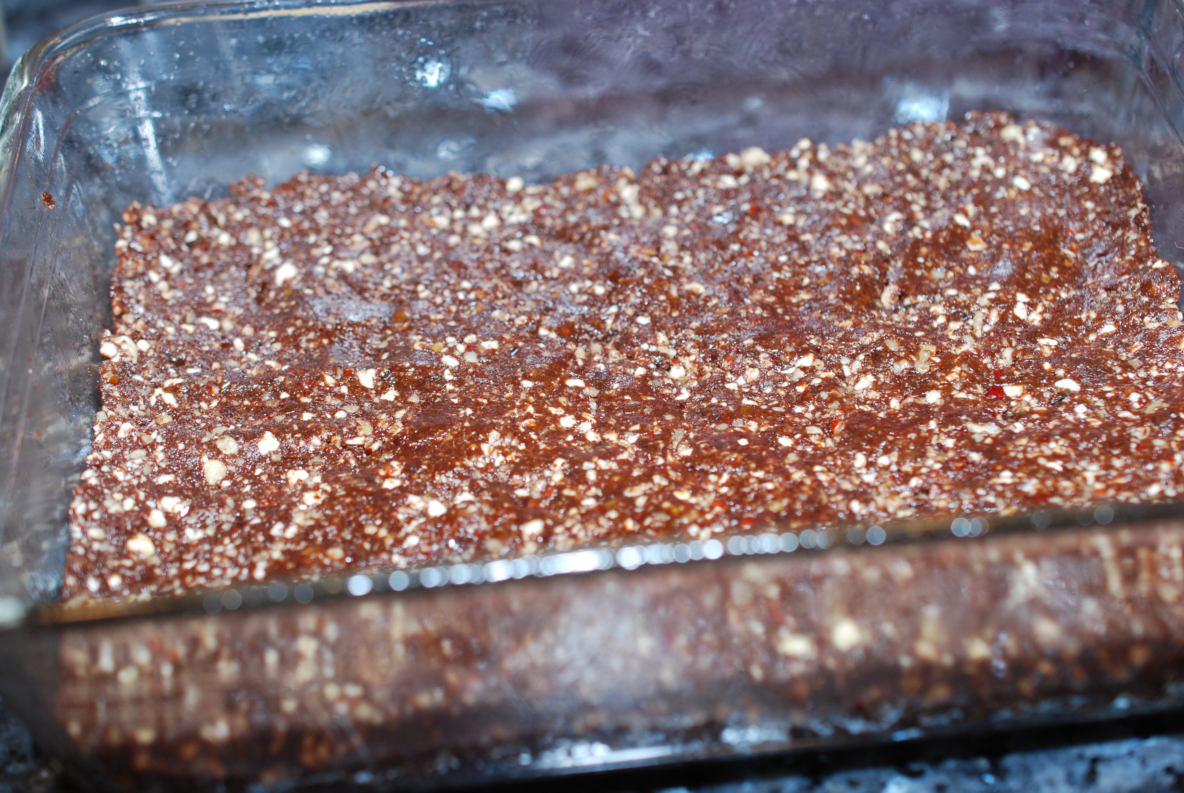 Remove from processor and press evenly into the bottom of  pan that is lightly greased with a tiny bit of coconut oil or covered with parchment paper.  I used an 8x6x2″ pan, but you can use a regular 8×8″ pan (the layers just won’t be as thick).