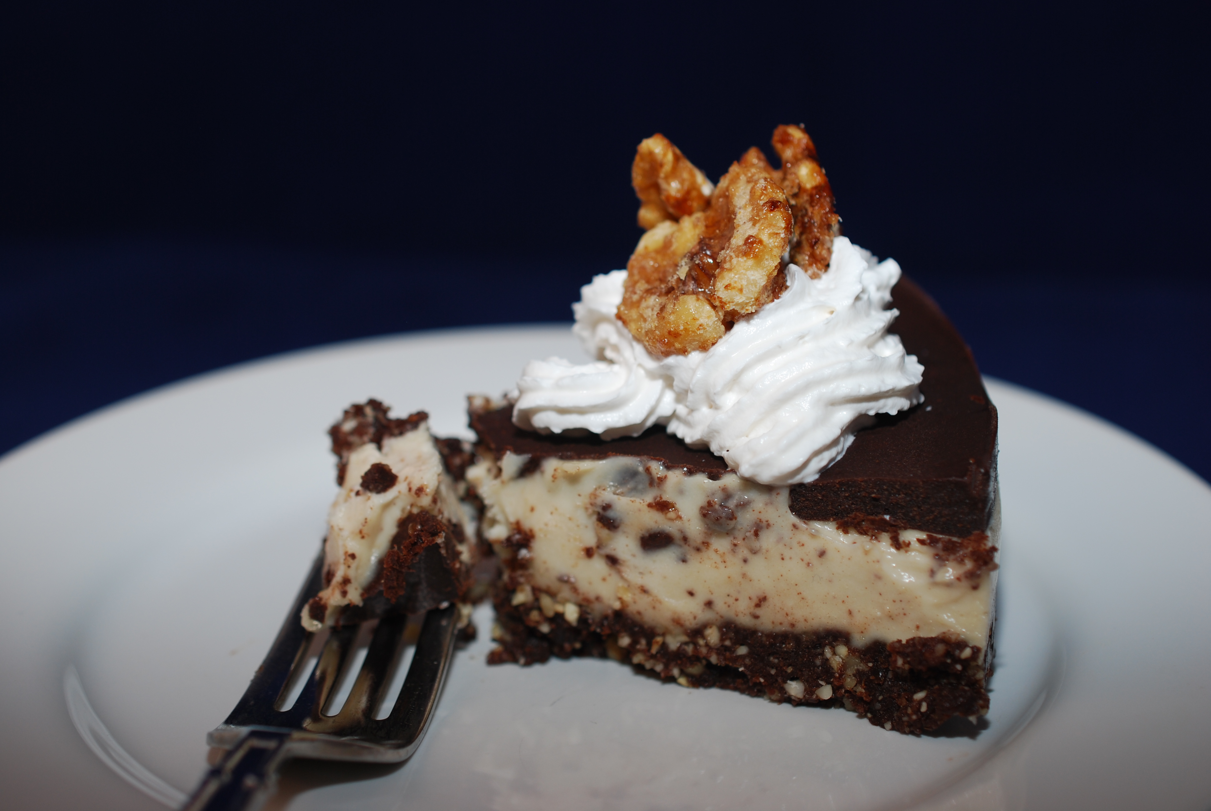 Raw desserts are rocking my world! Wow! I never knew anything could be so delicious without refined carbs and unhealthy oils. And so easy to make as well! I can’t stop making them. This one came out so delicious I couldn’t wait to share it. It does have a small amount of alcohol in it that is obviously not cooked out, so please keep that in mind. Nocello, walnut liquor, is so incredible it may be my very favorite after dinner drink. It was my inspiration for this dessert and that is why I added the pear, because walnut and pear pair perfectly (see what I did there?), and the candied walnuts for garnish. I guess I don’t need to tell you that I enjoyed a slice of this yumminess with a glass of warm Nocello. Perfection.