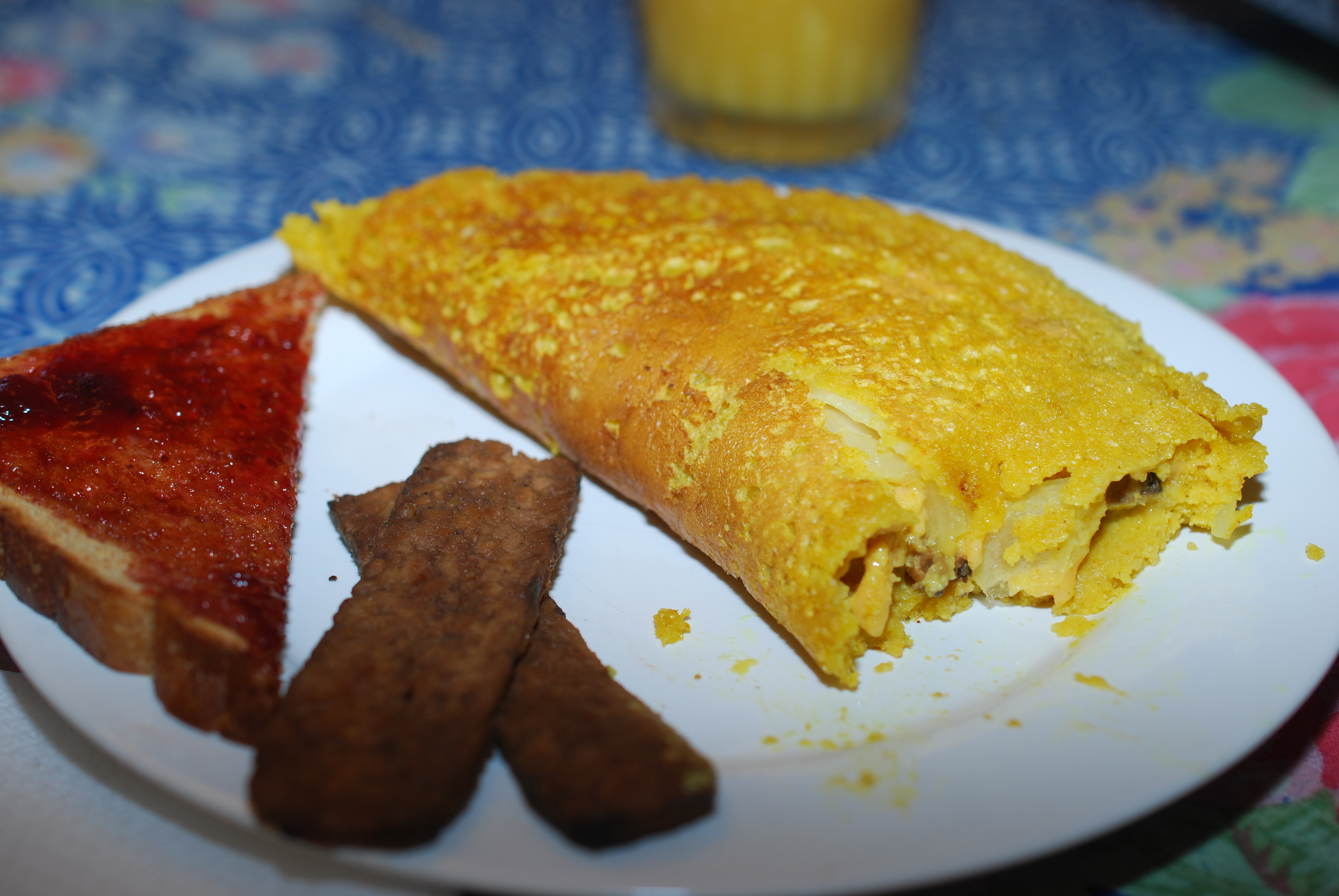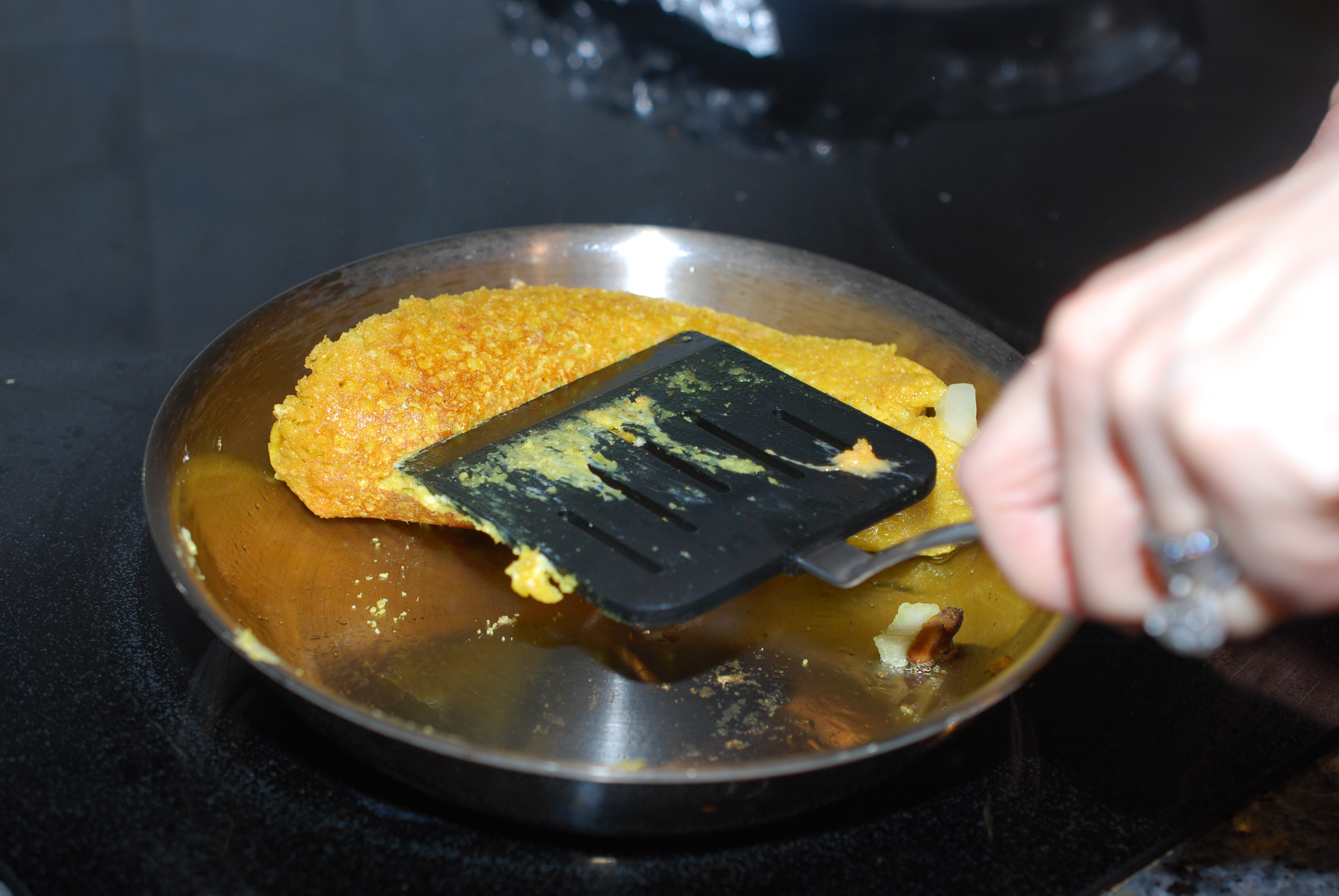 So – how about a great brunch idea for a holiday weekend? I know there is a lot of controvesry over even having a holiday named after Columbus, but all that aside, who isn’t happy for a day off and another excuse to have brunch? I love brunch – it’s my favorite meal! And I always loved omelettes with all the fixings and oozing with cheese. Think vegans can’t have that? Think again! Enter the chickpea omelette. There are lots of recipes online for chickpea omelettes and they are all wonderful! I tweaked them and came up with this recipe that incorporates all of my son’s favorite things. Since he was home from college for the weekend, I decided to make his idea of a perfect omelette. You can put anything in the omelette that you like. Mushrooms, peppers, tomato, capers, spinach – anything really! While tofu scramble may technically taste more like eggs, because this is so reminiscent of the look and shape and texture of an omelette, it is amazing and it tastes great as well! It is also so easy and quick to make!!