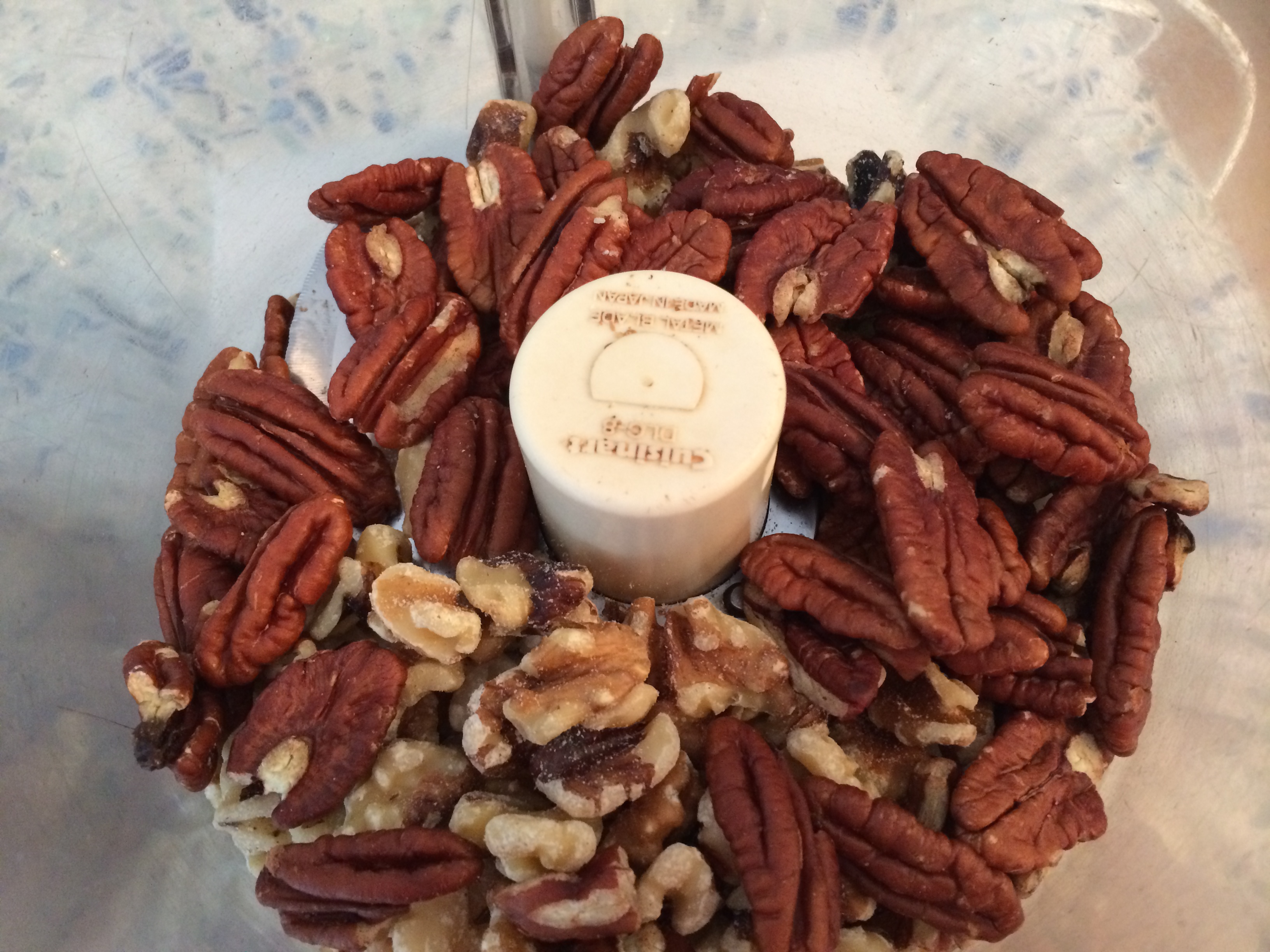 Place pecans and walnuts in food processor and process into small pieces like sand. Add the remaining ingredients and process until it comes together into a ball.
