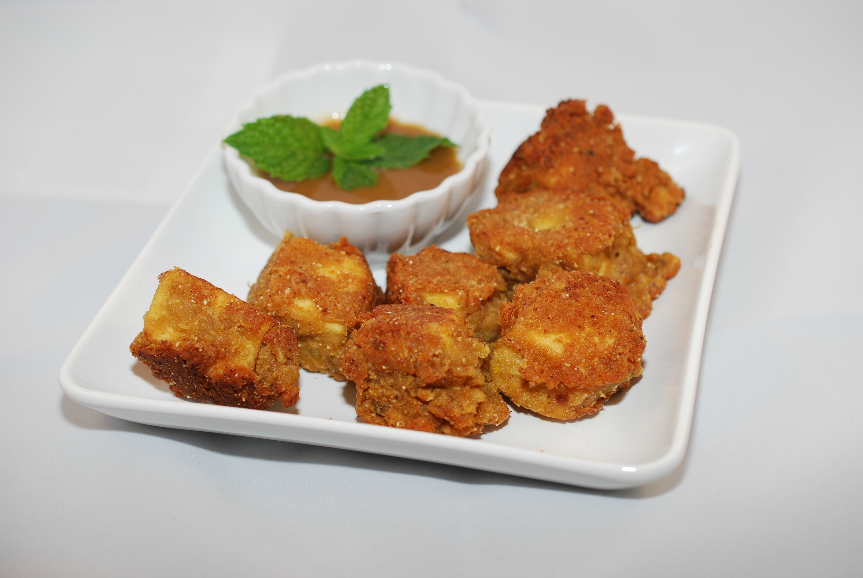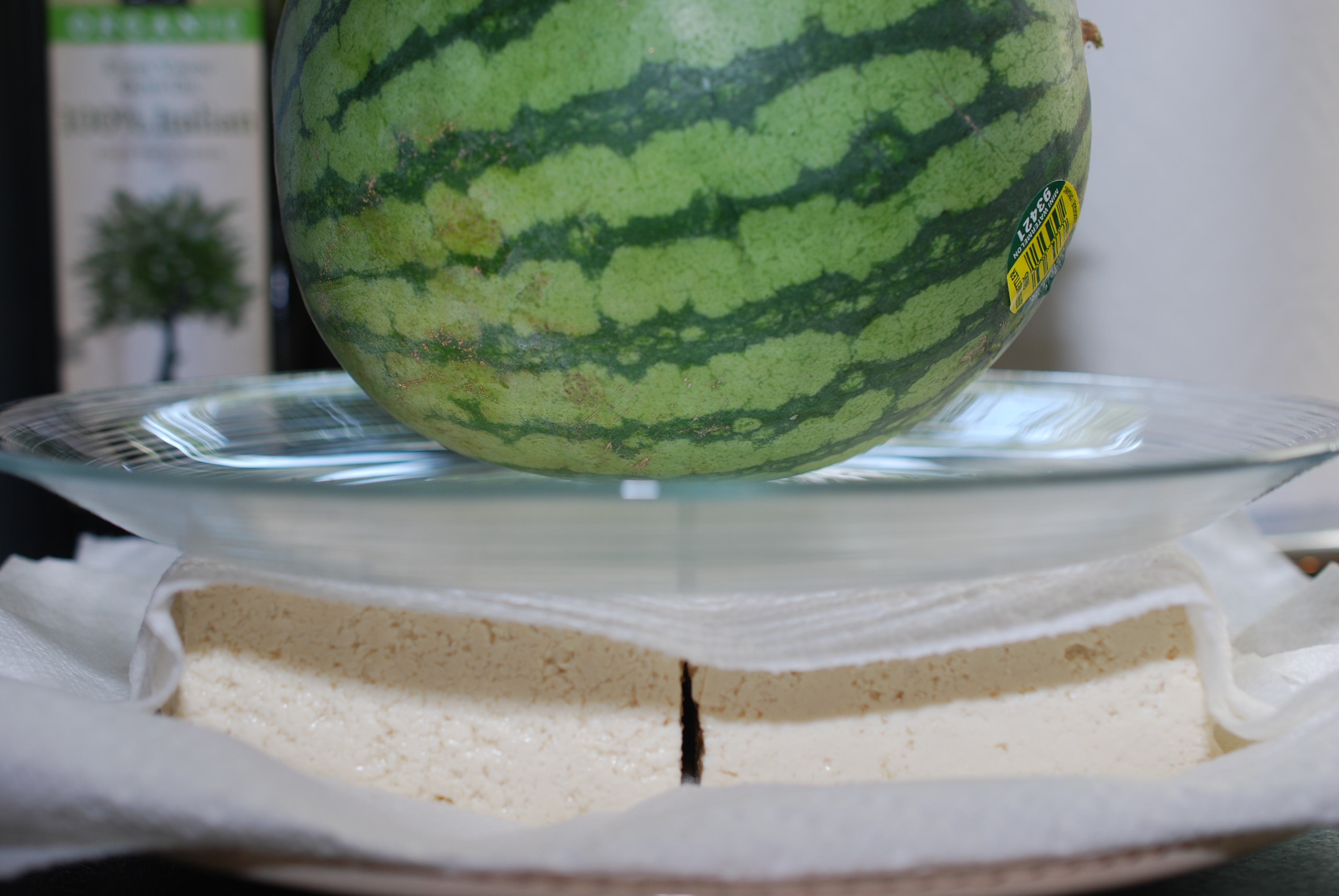 Cut a piece of tofu from the pan that measures approximately 1.5″ x 3″.