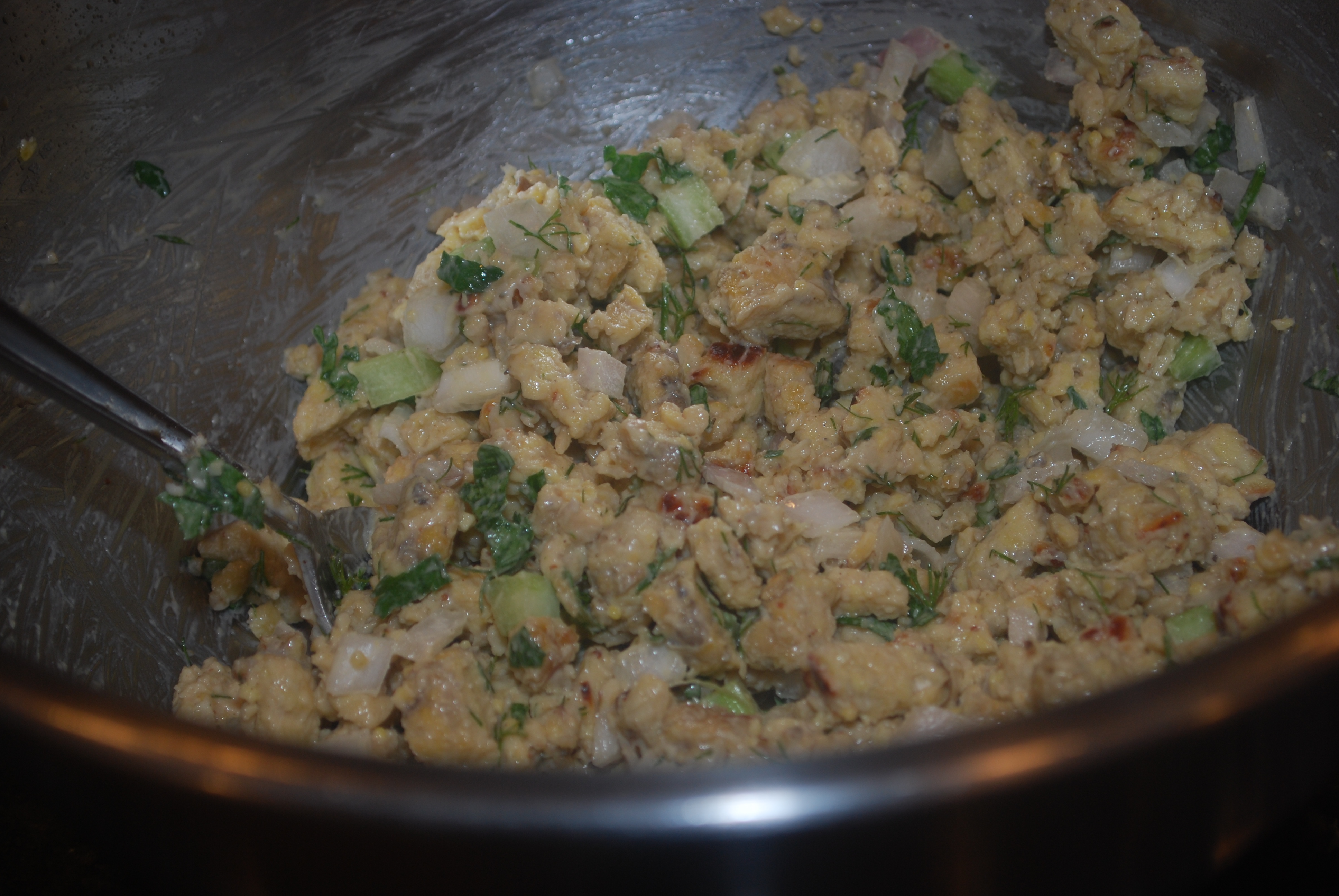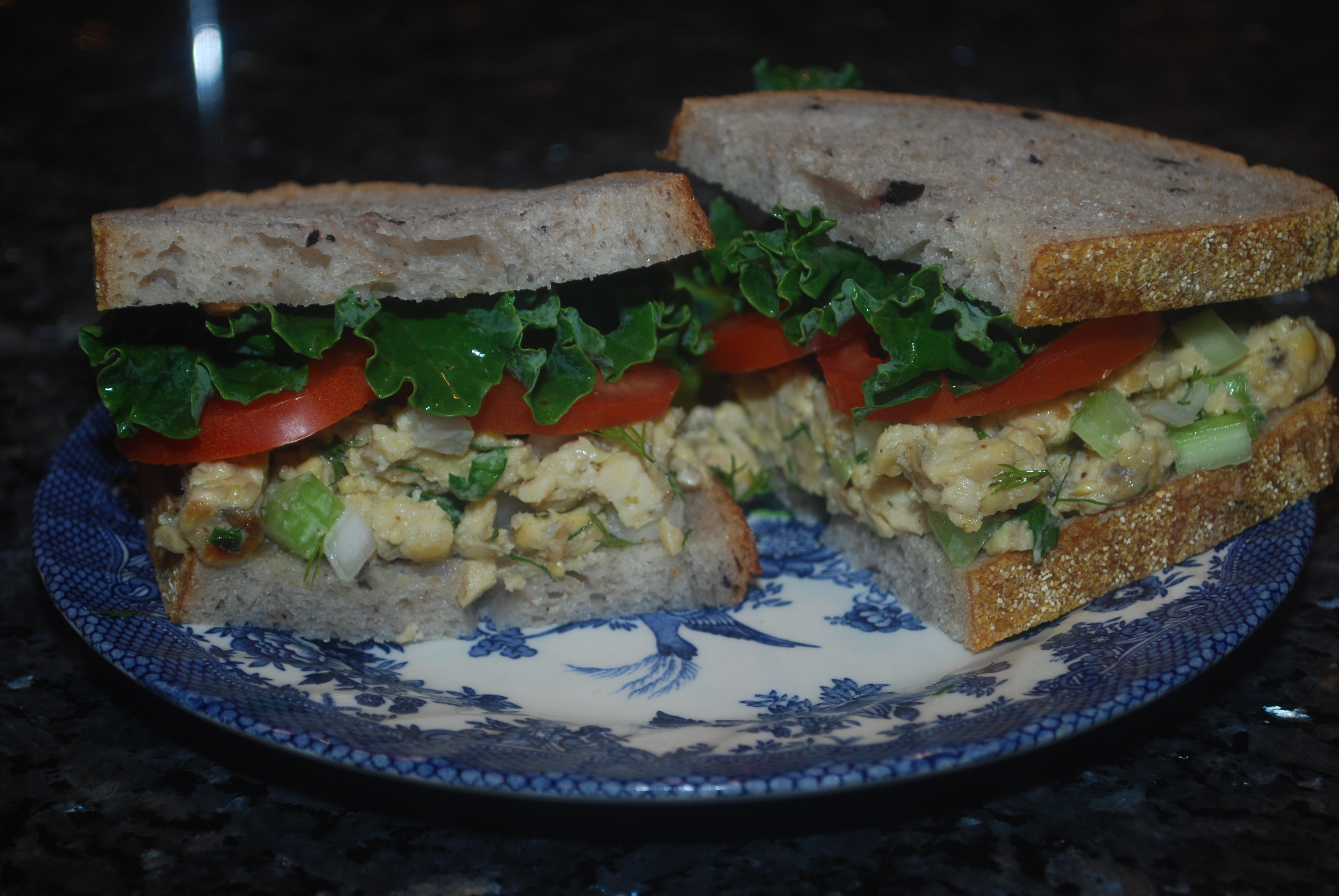 In a small bowl, mash the chickpeas. Add mayo, pickles, celery and remaining onion. Mix well. Add jackfruit mixture and combine well.